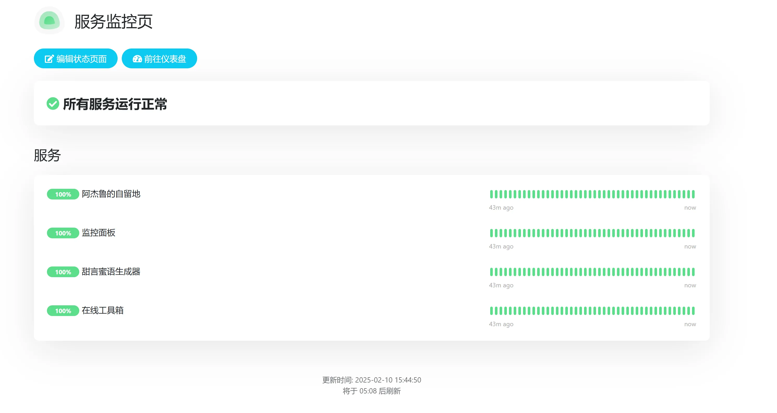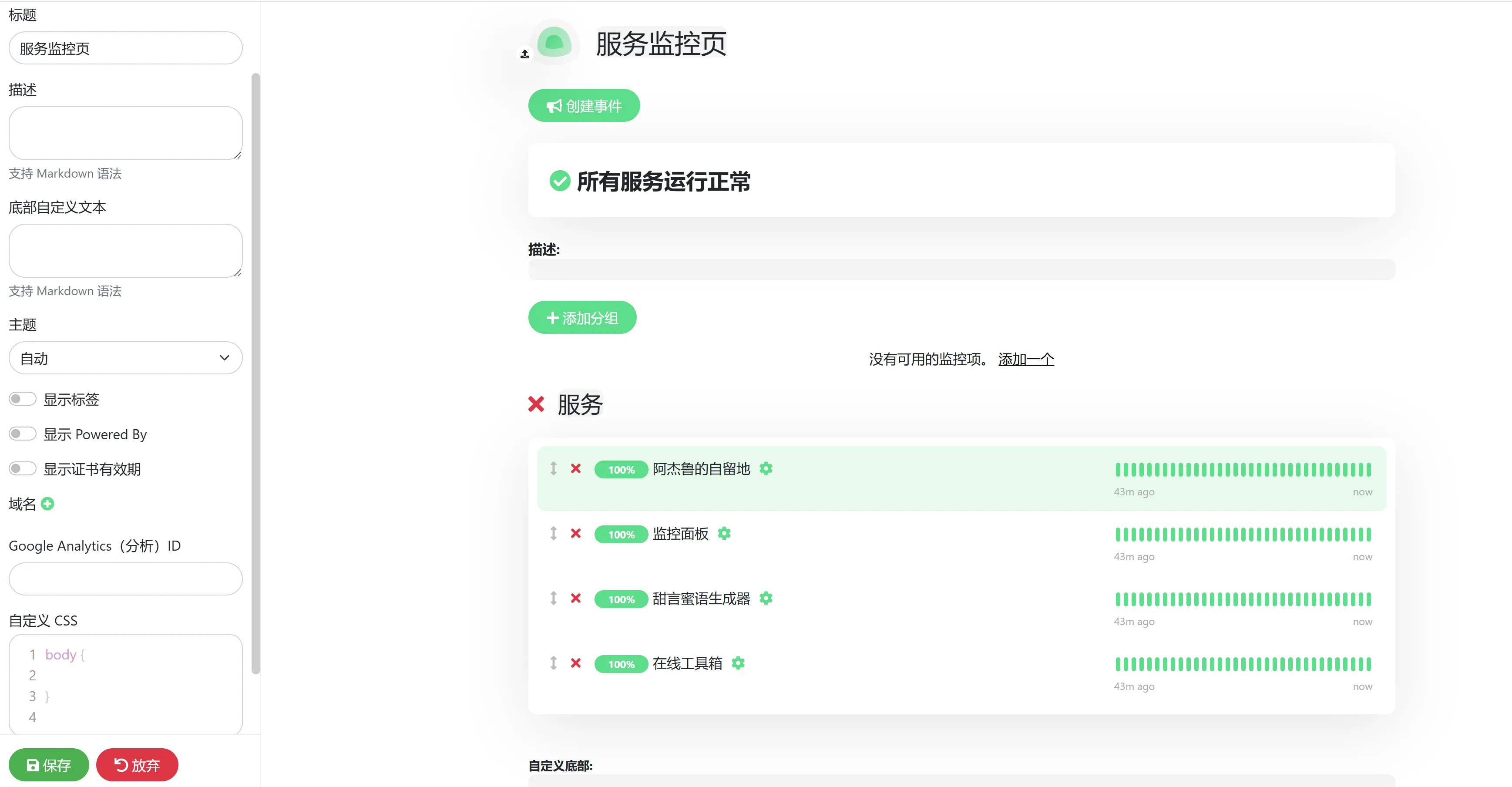 Uptime Kuma支持自定义的监控的状态页(状态页无需登录就可以查看被监控服务的状态信息),状态页面还可以自定义css,也就是说你可以自己给监控页面加上一些特效,更换你喜欢的背景图片等等,可塑性很强!