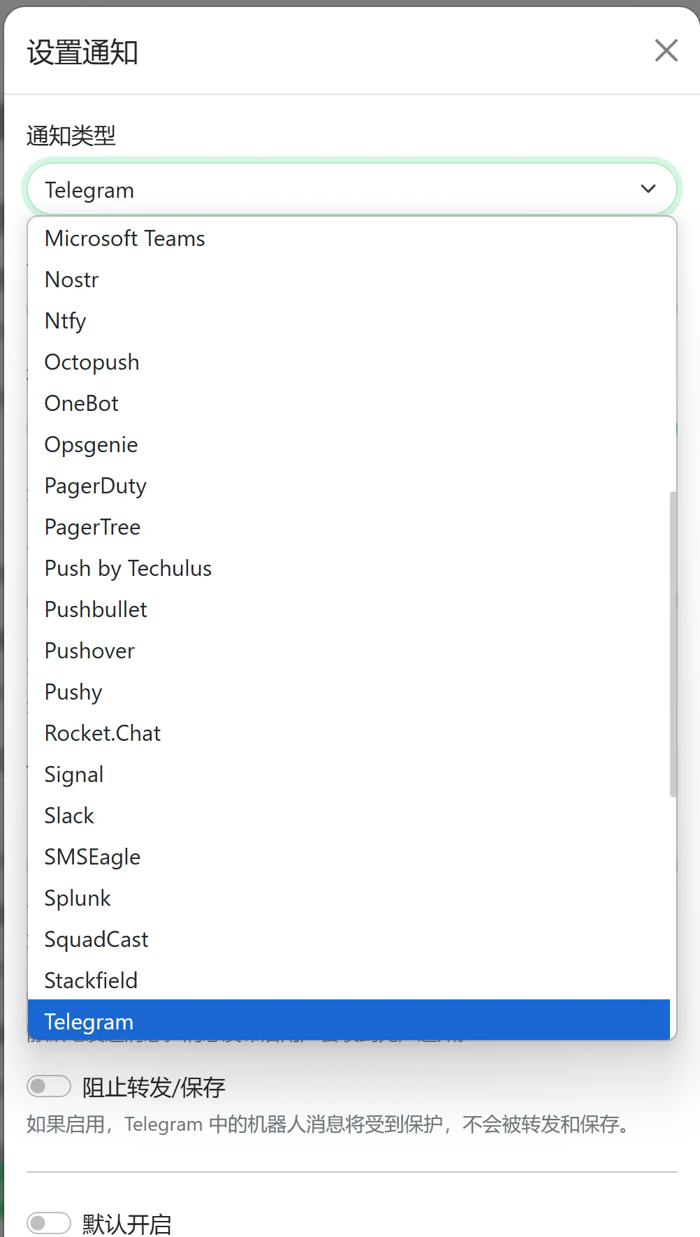 Uptime Kuma 支持多种告警通知方式,常见的如钉钉自定义机器人、飞书、server酱、telegram等,完整的支持类型可以参见 https://github.com/caronc/apprise/wiki 当前已经支持 100+ 通知方式。
