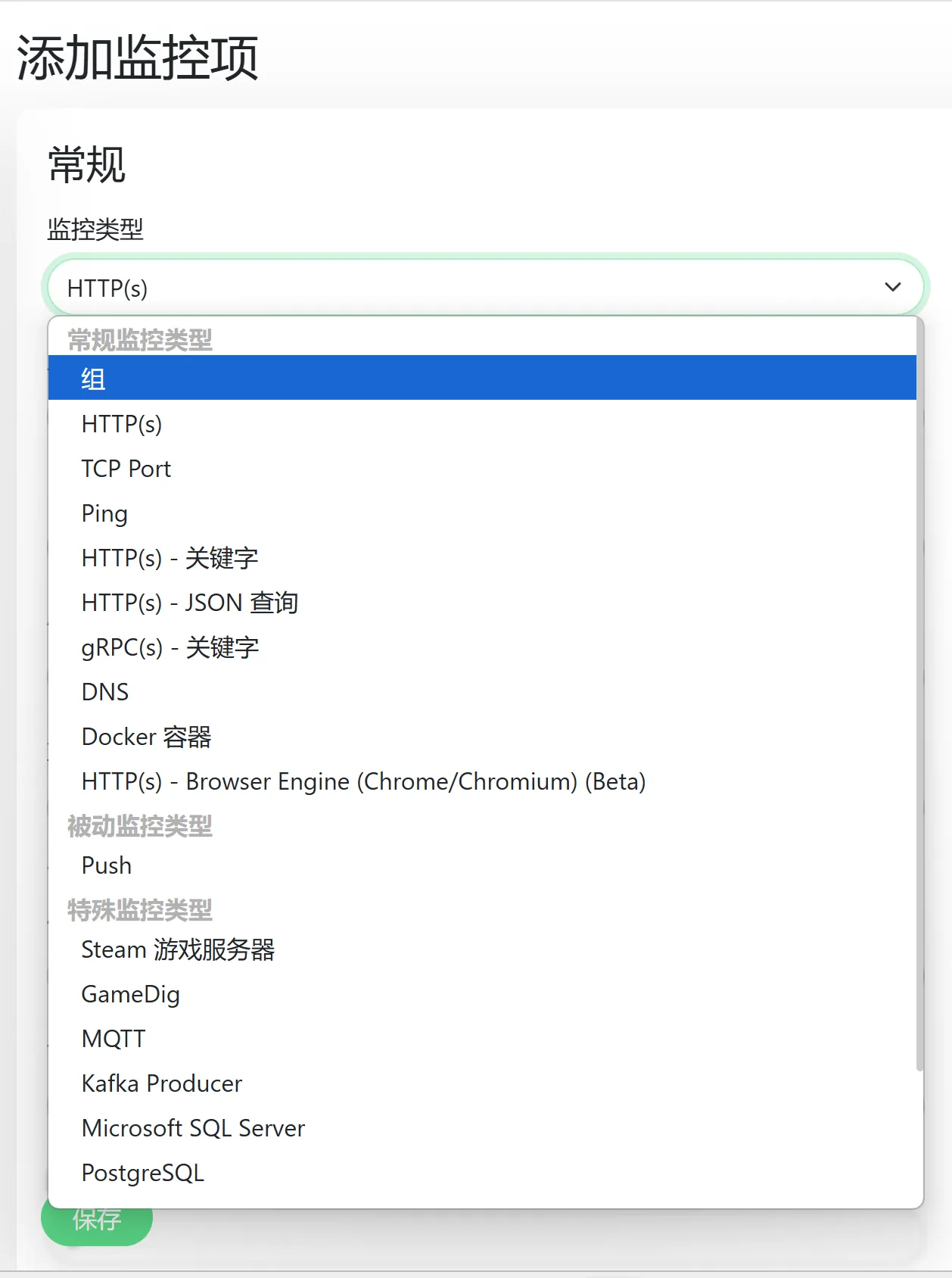 Uptime Kuma 支持多种监控类型,包括常见的 HTTP、Ping。