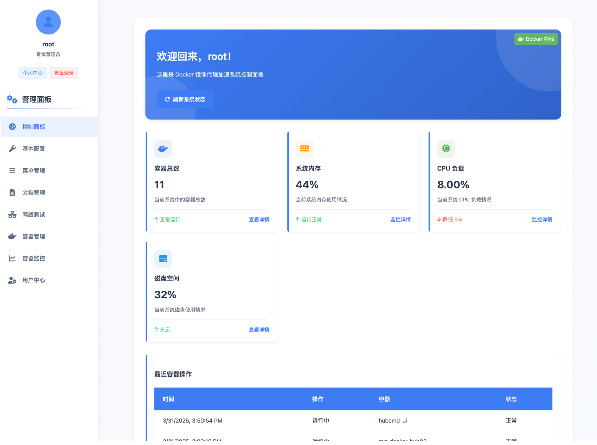 HubCMD-UI服务,面板展示、镜像搜索、文档教程、容器管理、容器监控、网络测试、用户中心等功能